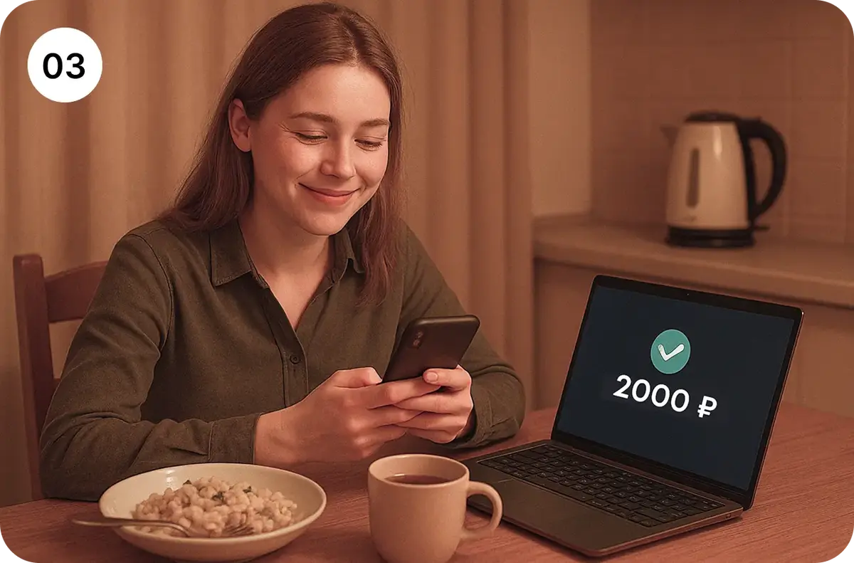 - Через час на счёт приходит 2 000 рублей.
